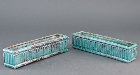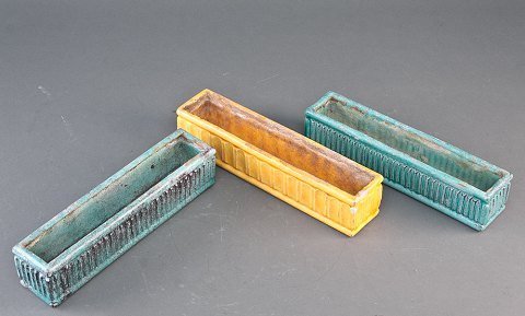 Svend Hammershoi for Kähler. Flower pot holder with yellow glaze. The two green flower pot holders are sold. Signed "HAK". 1940s. Height 7 cm, length 30 cm. In good condition.
