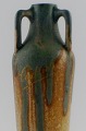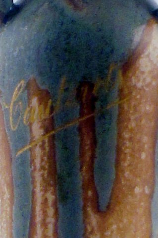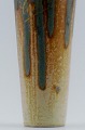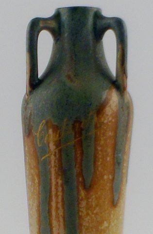 Signed. Conical vase, blue-gray glaze running on beige-brown ground, France around 1910.