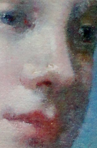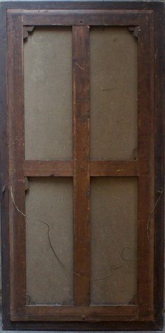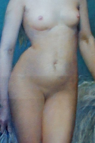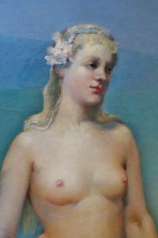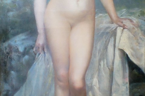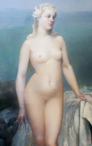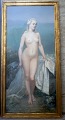 Stort fransk oliemaleri, utydeligt signeret, 1887. Ung nøgen blond kvinde med blomsterkrans på hovedet, bakket landskab i baggrunden. I god stand. Måler 150 x 70 cm. (uden rammen) Smuk antik ramme.
