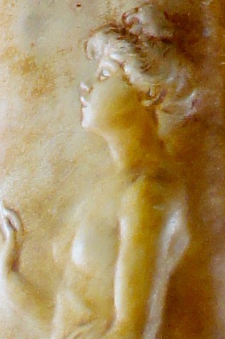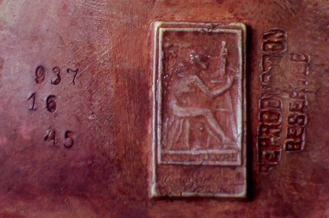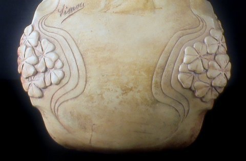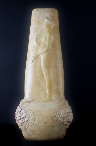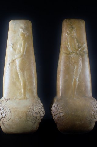 Pair of French Art Nouveau floor vases in terracotta. Signed "Simone", hallmarked. app. 1900. In good condition, one vase with repair. Measures 61 x 26 cm.