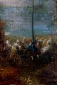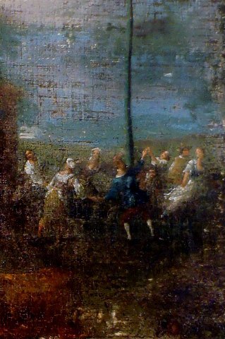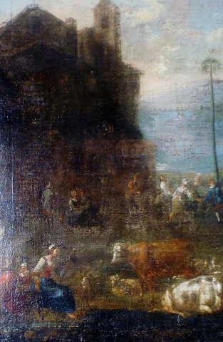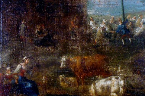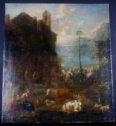 Unknown Flemish Old Masters, 17/18 c. Oil on canvas. Pastoral landscape with figures in dance, shepherds, cows and sheeps in the foreground. Unsigned. Wear and some crazing. Relined. Measures 70 x 77.5 cm.