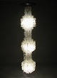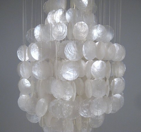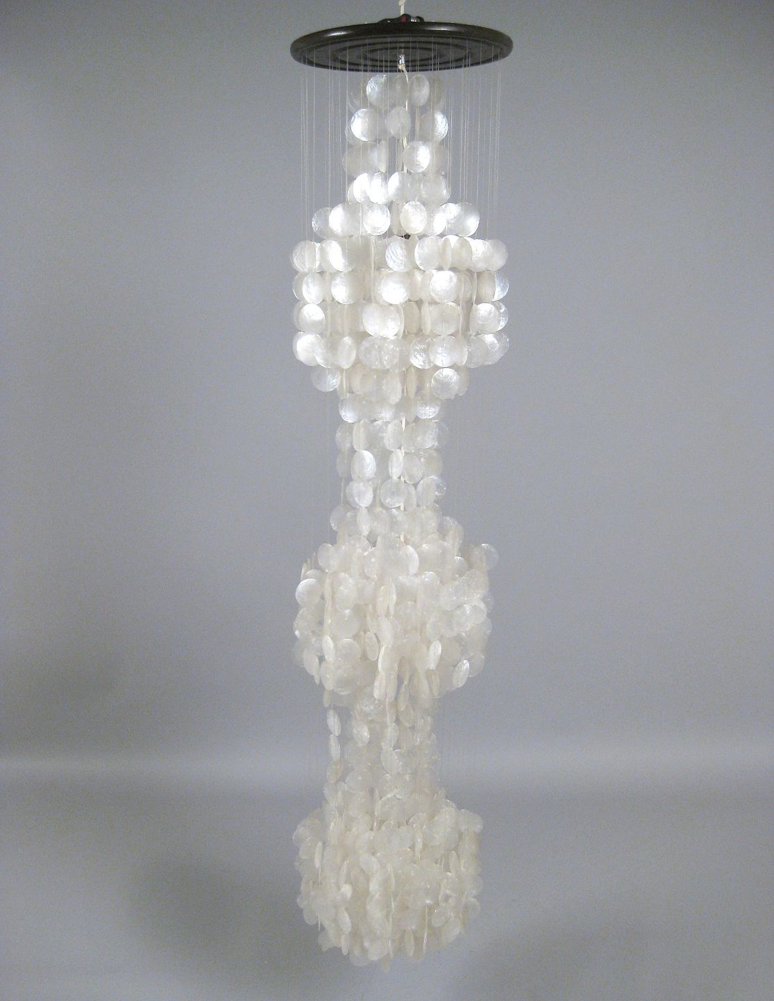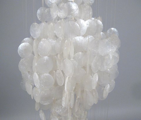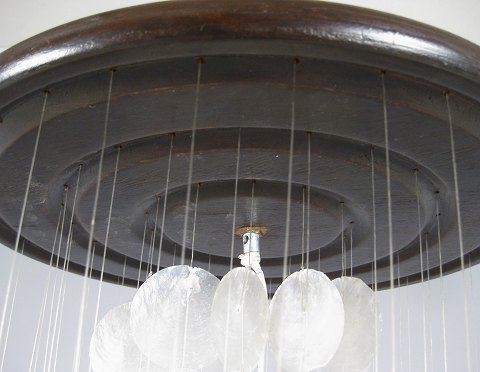 Seashell pendant lamp with mother of pearl flakes. Construction with ceiling panel made of dark-stained wood, numerous pearl flakes to nylon strings. D. 35cm, H. 170cm. In good condition.