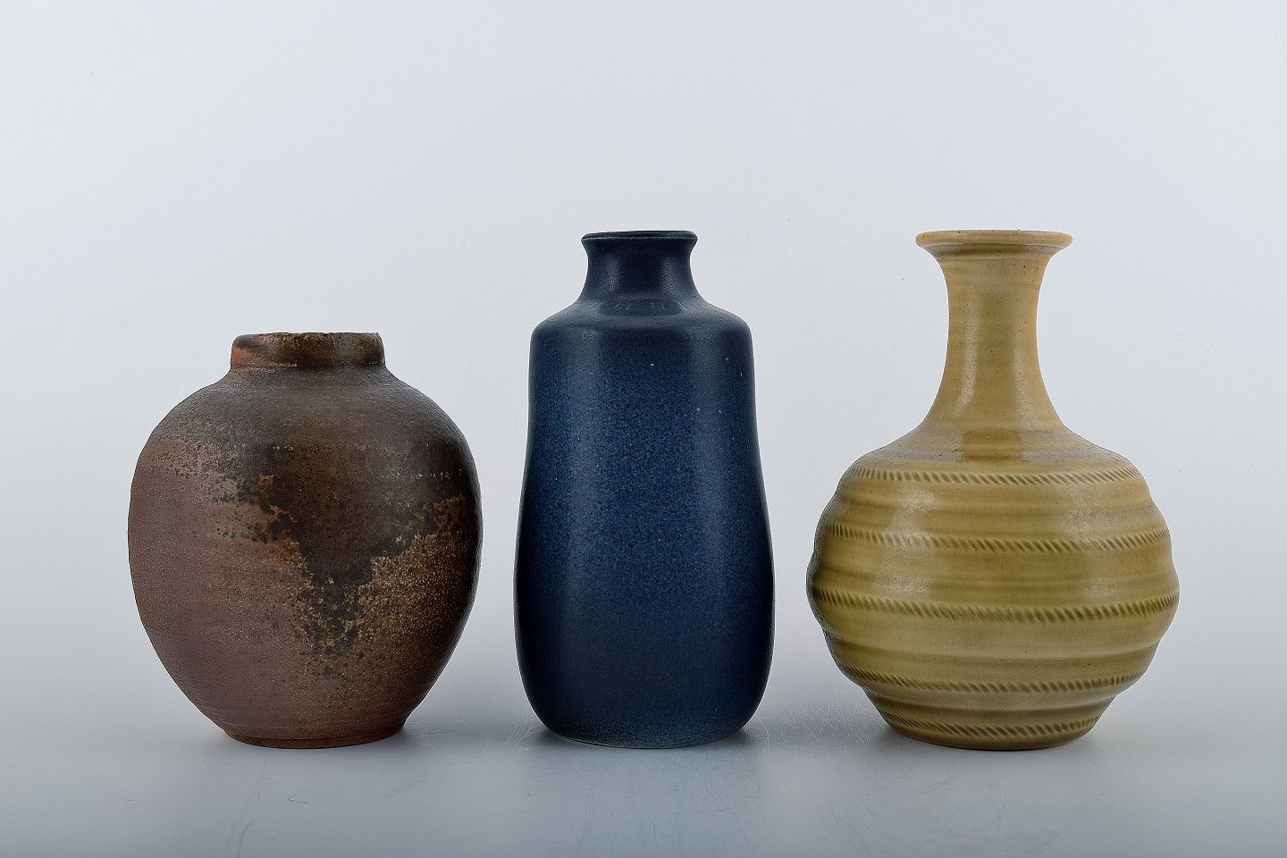 3 stentøjsvaser. Utydeligt stemplet. Måler : 16.5 cm, 12 cm. samt 16.5 cm. I perfekt stand. Priser fra kr. 300 pr. stk.