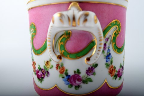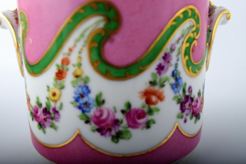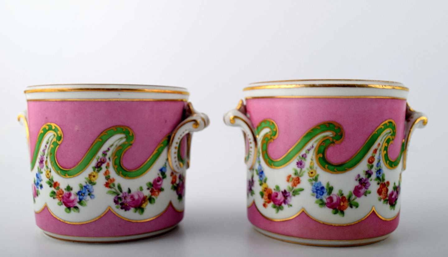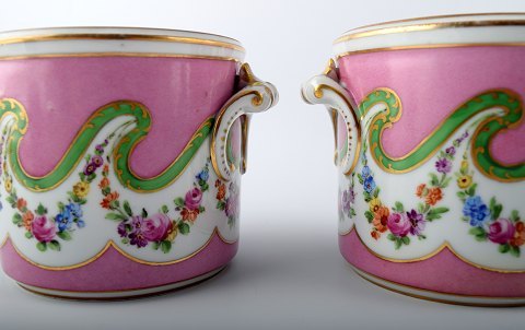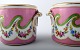 A pair of French 19 c. flower pots, hand painted with flowers on pink background. Stamped. In perfect condition. Measures 12.5 x 9.5 cm.