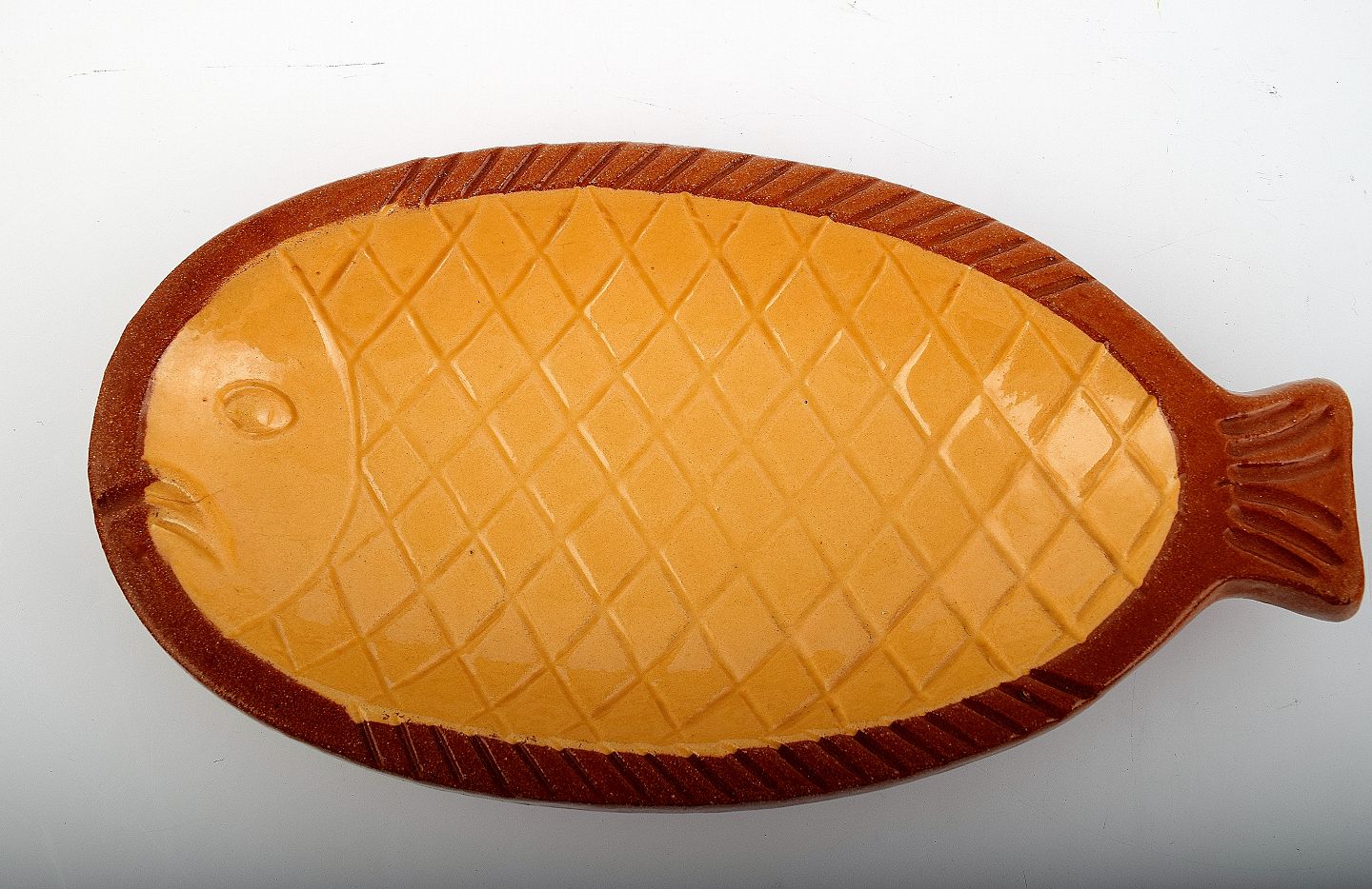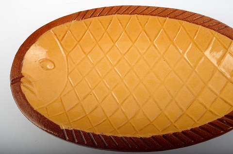 Höganäs keramikfad udformet som fisk. I perfekt stand. Måler 30 cm. Stemplet.