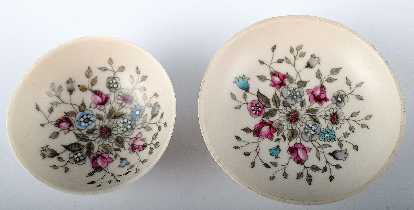 Eteri Tomula for Arabia, finsk design. To porcelæns miniatureskåle, dekoreret med blomster. Måler 7 cm. og 5.5 cm. i diameter. I perfekt stand.