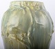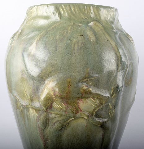 Large Höganäs Art Nouveau ceramic vase. Bird on branch in relief.