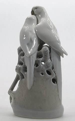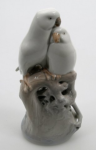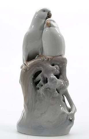 Kgl. figur, Royal Copenhagen, nummer 649. Papegøjer på grene af Th. Madsen 1905. 19 cm. høj. 1. sortering. I perfekt stand.