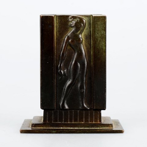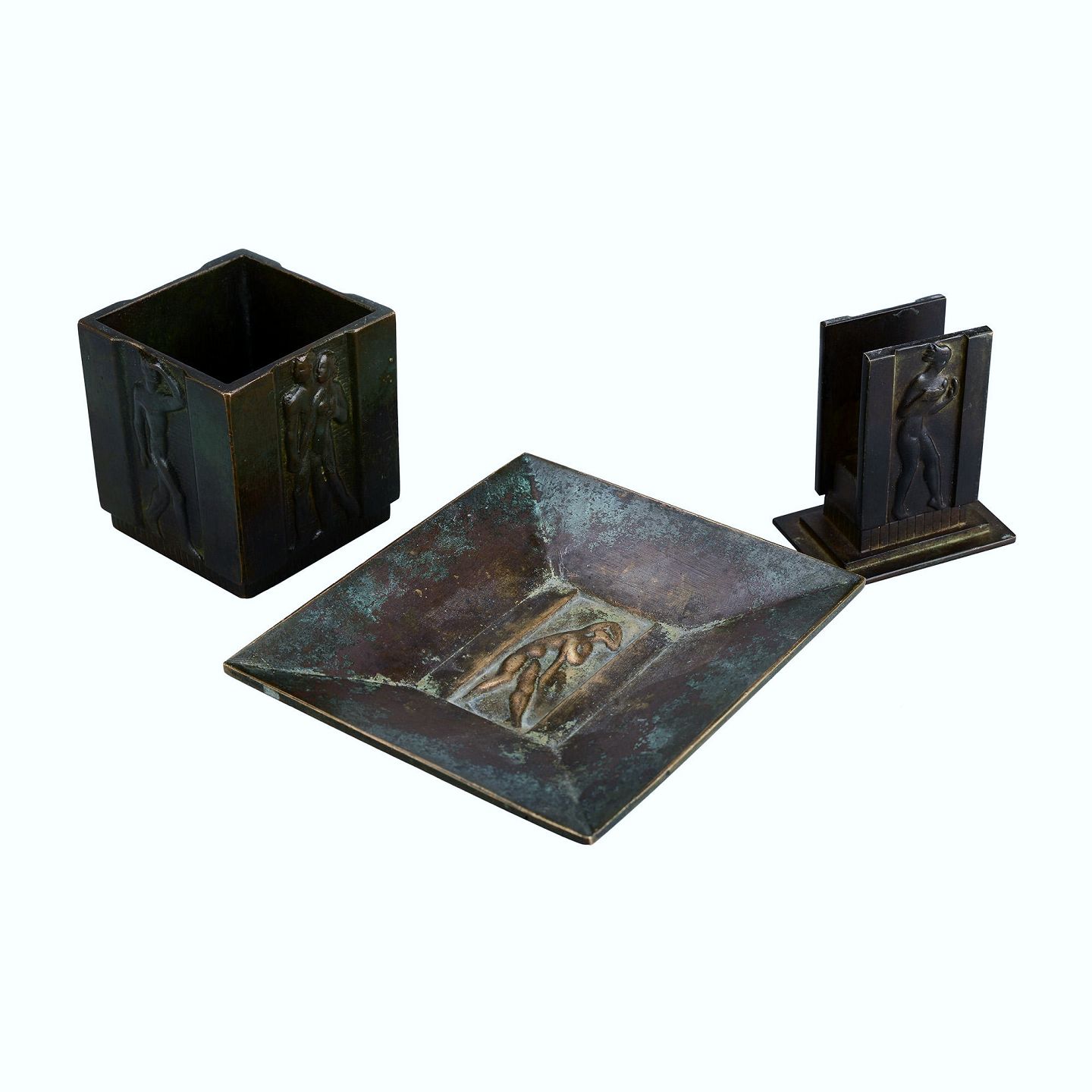 3 pieces, bronze, 1930s, art deco, GAB bronze. Bowl, vase and holder for matches. Hallmarked The dish measures 13x11 cm. Good condition, beautiful patina.