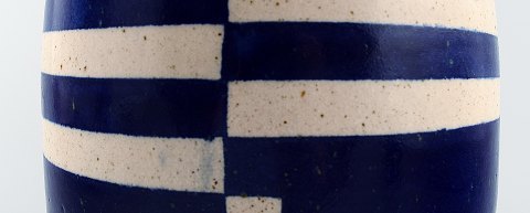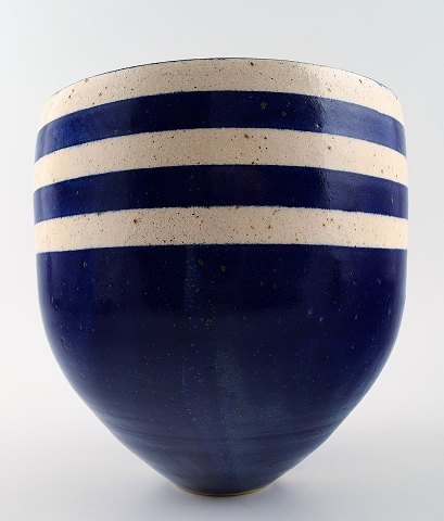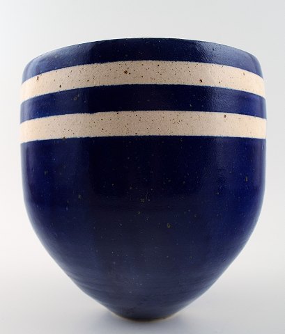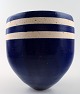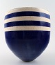 Janus Simmelsgaard, unique pottery vase, dark blue with white stripes. Signed. Measures 17 x 19 cm. In perfect condition.