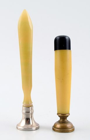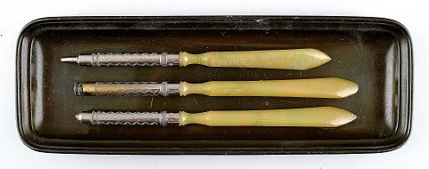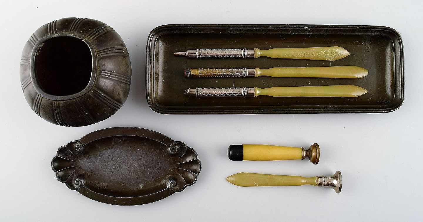 Just Andersen pennebakke (1826), vase, lille fad (D121) samt diverse redskaber. Pennebakke 20.5 cm. langt. Vase 8 x 8 cm. Fad 12 cm. I god stand. Vase med slidtage.