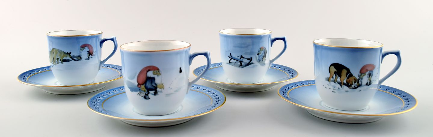 B&G (Bing & Grøndahl) 4 personers kaffeservice, Juleservice, Harald Wiberg. 4 kaffekopper, 4 underkopper. 1. sortering, i perfekt stand. Stemplet.
