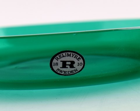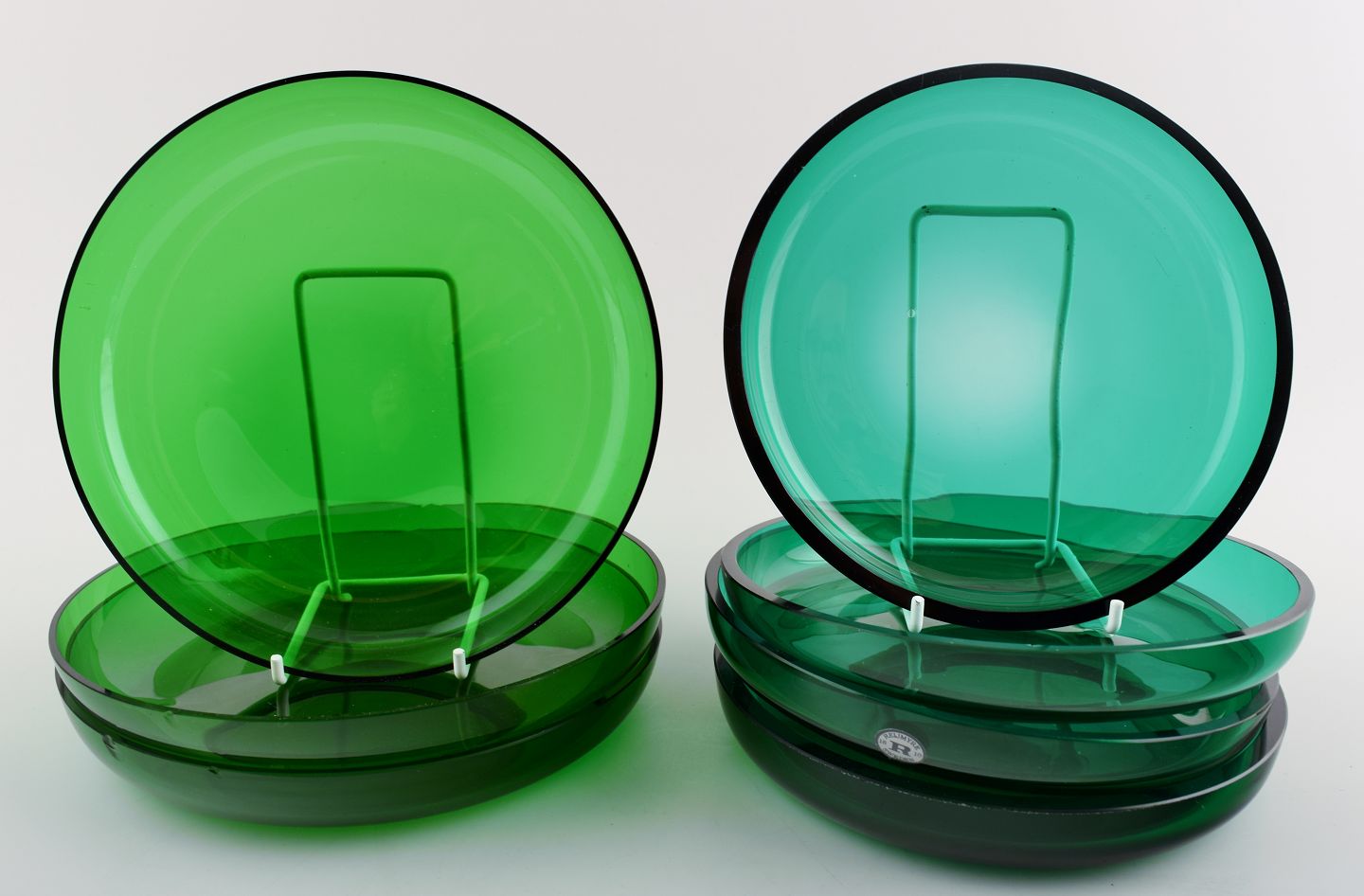 4+3 tallerkener/asietter i grønt glas, Josef Frank. Firma : Reijmyre/Gullaskruf. I god stand. Måler : 18 x 3.5 cm. og 16.5 x 2.5 cm.