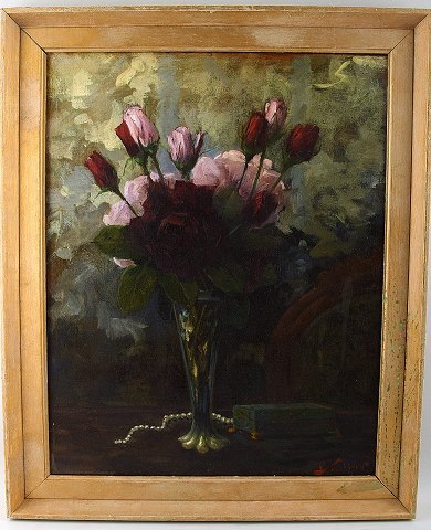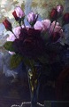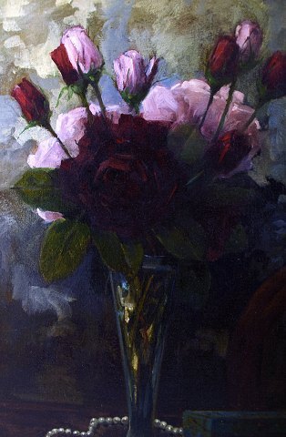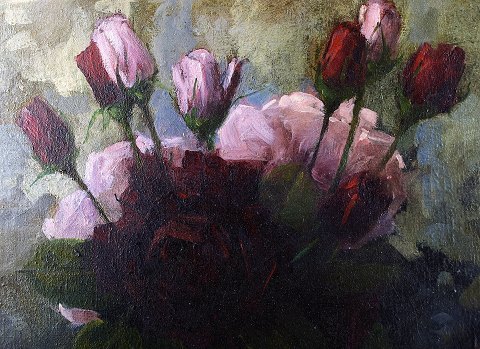 Blomsteropstilling, olie på lærred. Røde og lyserøde roser i vase.