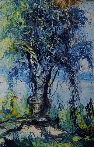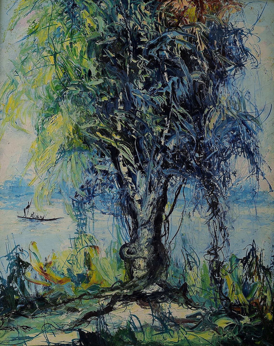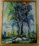 Tropical landscape with river. Oil on board. Signed illegible. Measures 38 x 48 cm. The frame measures 2 cm. In perfect condition.