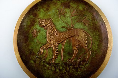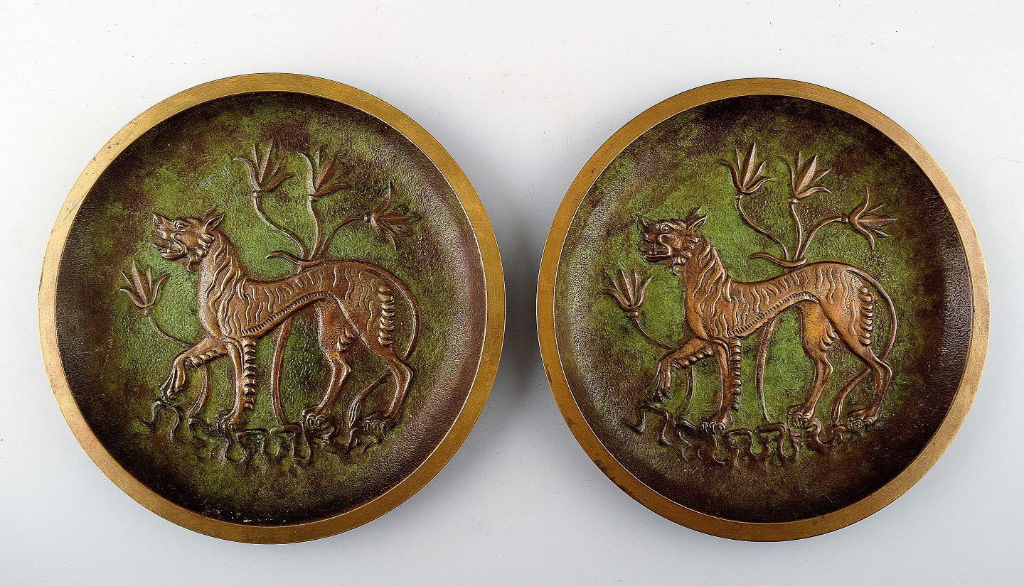 Et par art deco Tinos Bronze fade af massiv patineret bronze støbt med dyr i landskab, mærket Tinos, ægte bronce, Made in Denmark. 1930'erne. Diameter 22 cm. I flot stand, smuk patina.