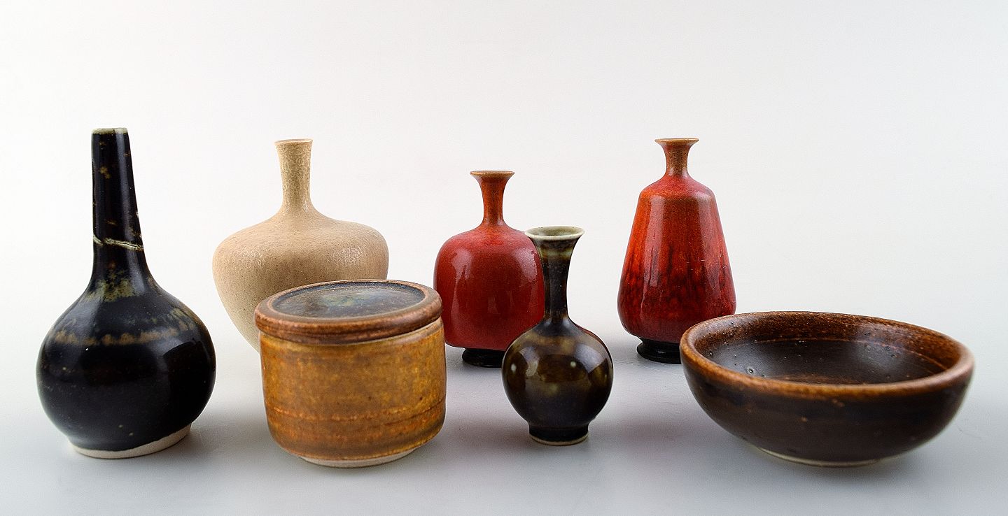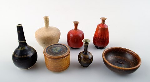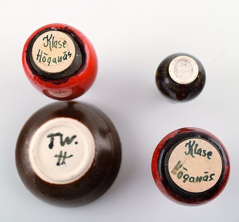 Collection of Höganäs miniature vases and bowls, a total of 7 pieces. Signed, JA (John Andersson) and Klase etc. In perfect condition. Highest 7 cm.