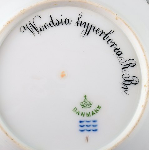 Antique Royal Copenhagen Flora Danica dessert plate. Early mark. Hand painted in highest quality. 14 cm. in diameter. Latin name: Woodsia verticillatum L 1. factory quality, in perfect condition.