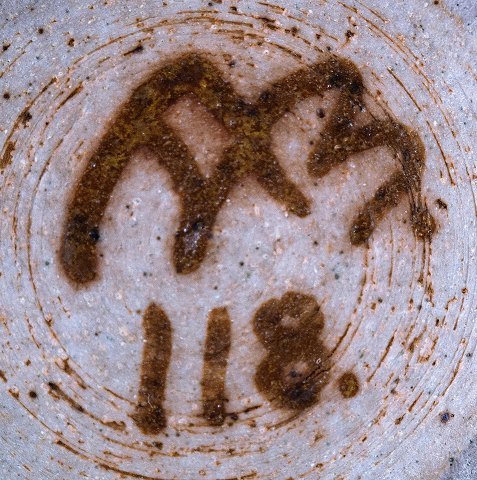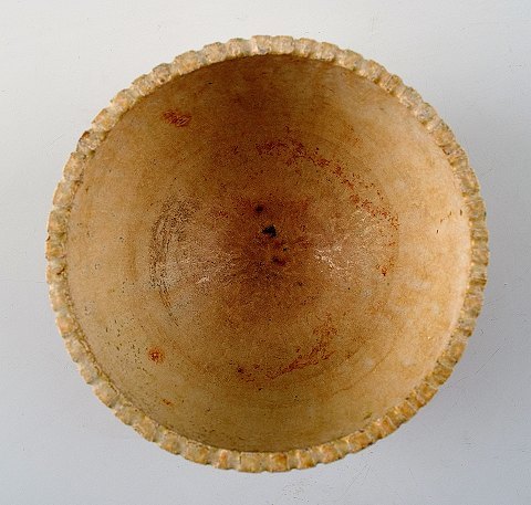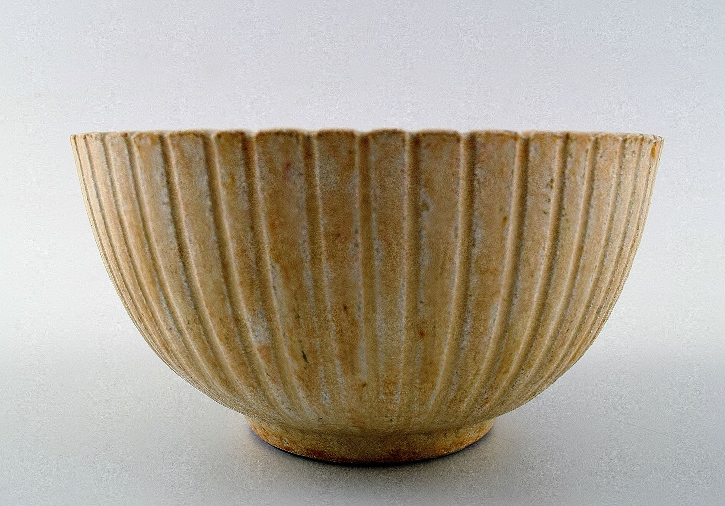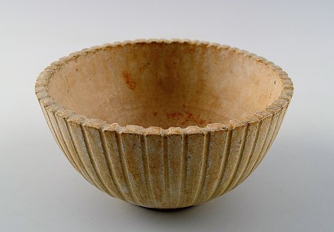 Skål af stentøj, yderside modelleret med riflet mønster.