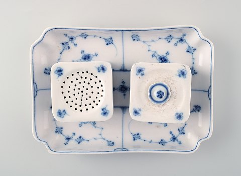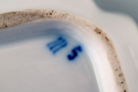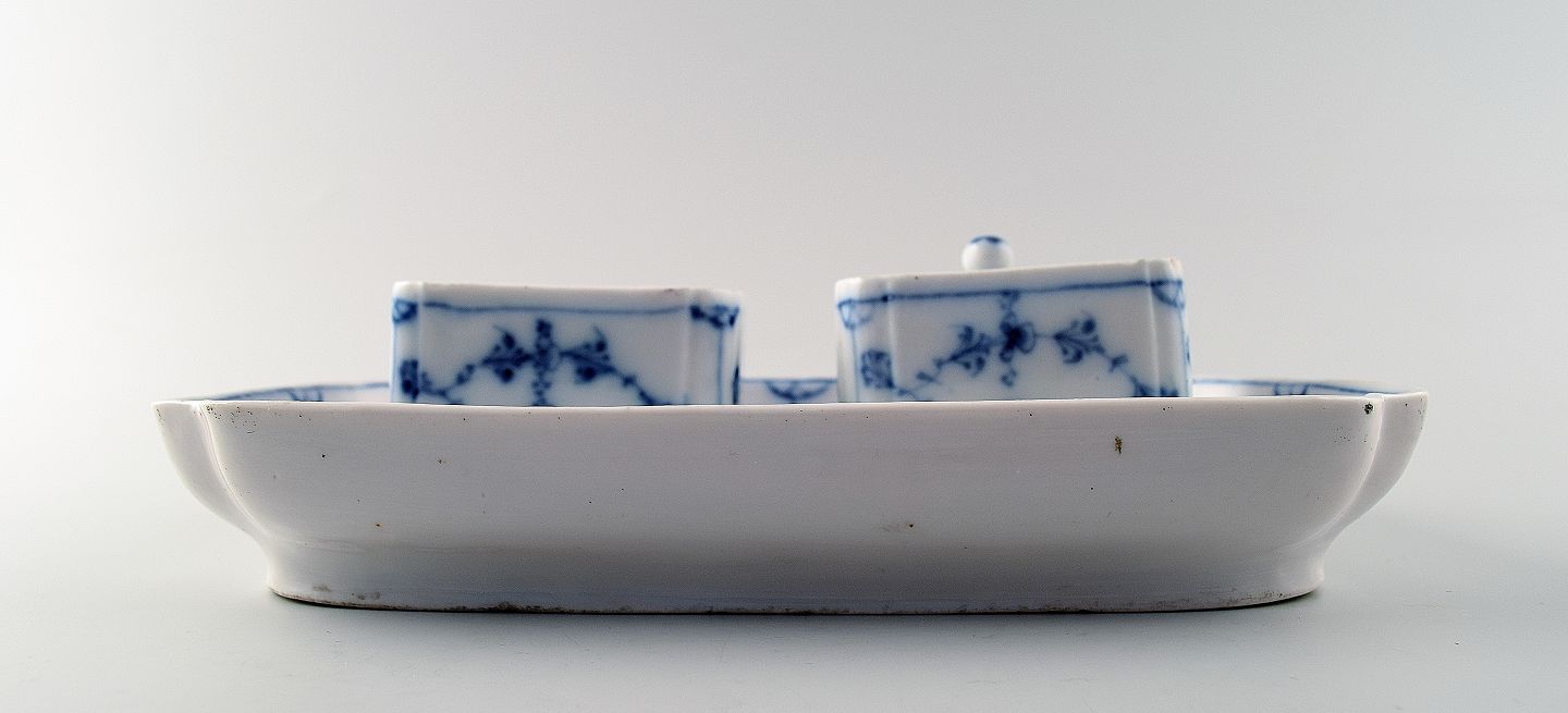 Tidligt og sjældent Royal Copenhagen musselmalet skrivetøj med to blækhuse. Stemplet, maler nummer 5, ca. 1800. 1. sortering, i god stand, ene låg med småskår. Størrelse: 21 cm. langt.