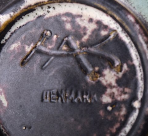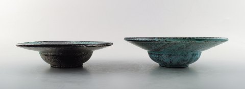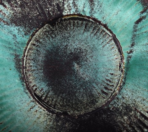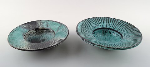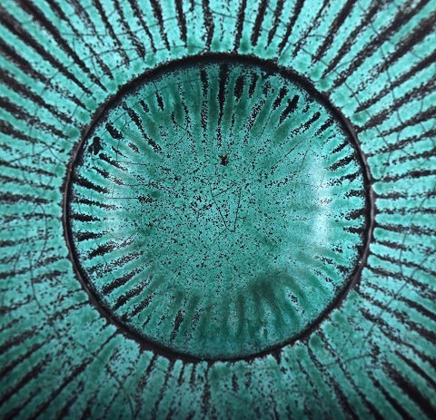 A pair of Kähler, HAK, round glazed bowls, Denmark 1930s. Designed by Svend Hammershøi. Turquoise Green / black double glaze. Measures 15 cm. x 4.5 cm. Marked. In perfect condition.