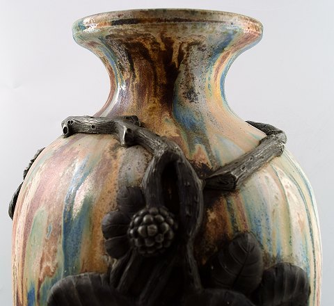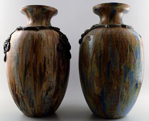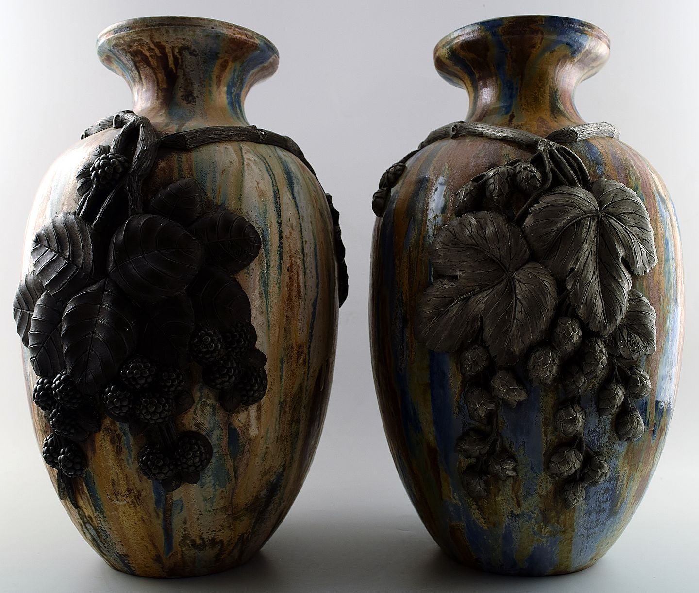 Roger GUERIN (1896-1954) A pair of large French Art Deco ceramic floor vases with blackberry stalks in relief. Very beautiful glaze. In perfect condition. Measures 41 x 22 cm. Marked.