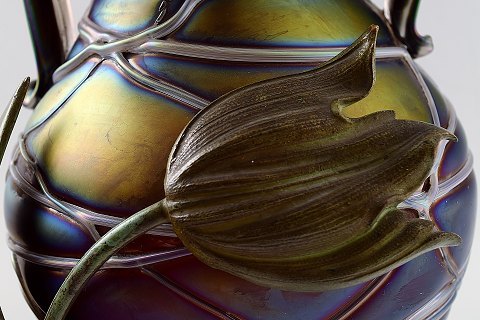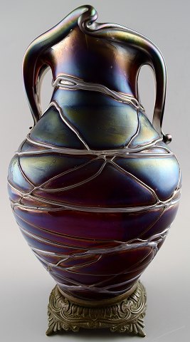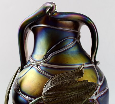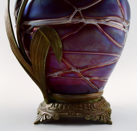 Art Nouveau art glass vase with bronze mounting. Approximately 1900. Measures 24 x 16 cm. In good condition.