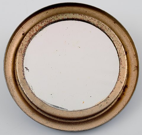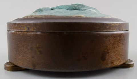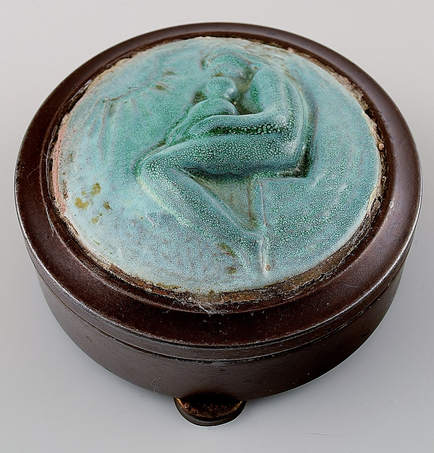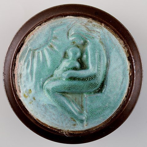 Pudderdåse/skrin i bronze. Art deco. Låg dekoreret med mor og barn, keramik i relief. Just Andersen stil, 1930´erne. Stemplet Bronze Bl. I god stand. Måler 10 x 3 cm.