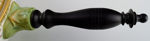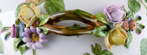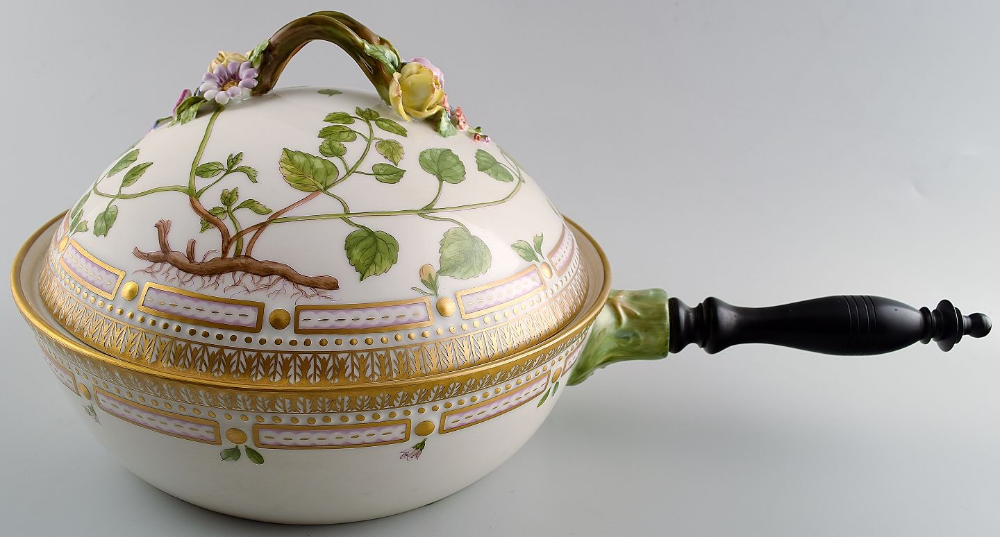 Royal Copenhagen "Flora Danica" porcelain vegetable dish, decorated in colours and gold with flowers. Handle of black painted wood.