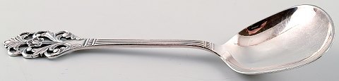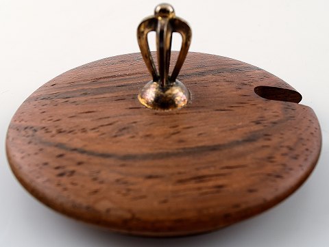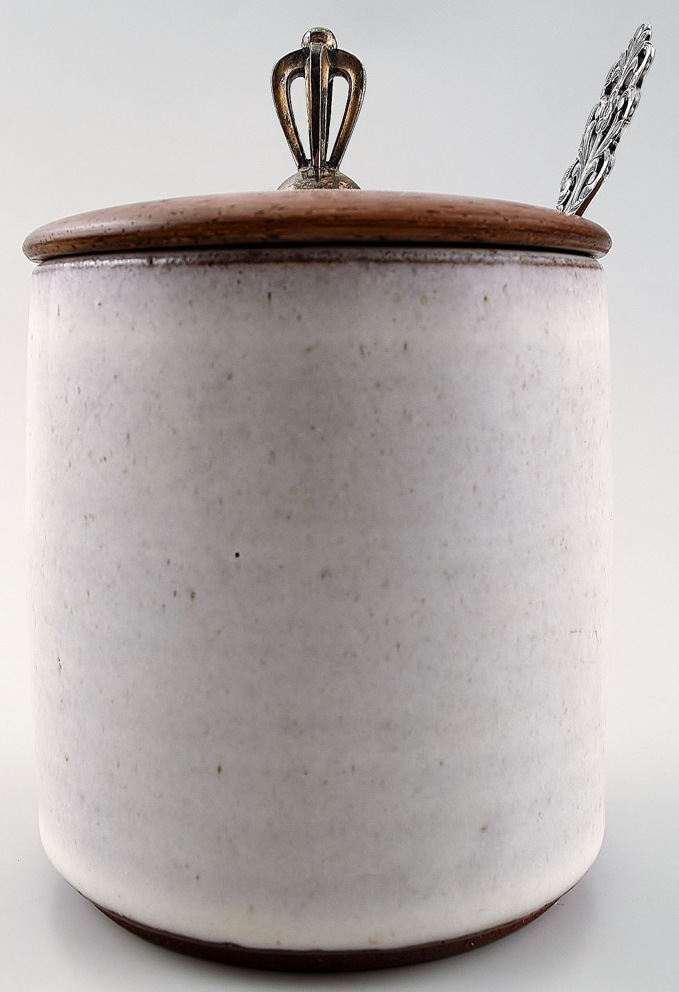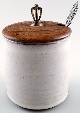 Dagnæs marmeladekrukke i keramik, tilhørende låg i teak med sølvknop, tilhørende sølvske. Stemplet. I god stand. Måler 8 x 12,5 cm.