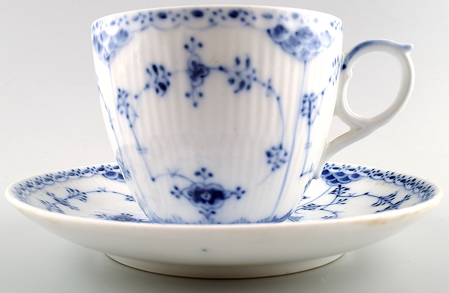 Royal Copenhagen Blue Fluted Half Lace Coffee cup and saucer. Number 703. Good condition. 2. factory quality.