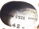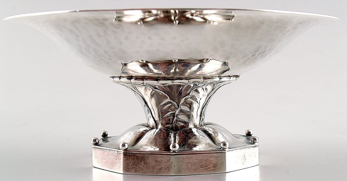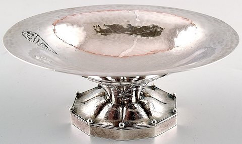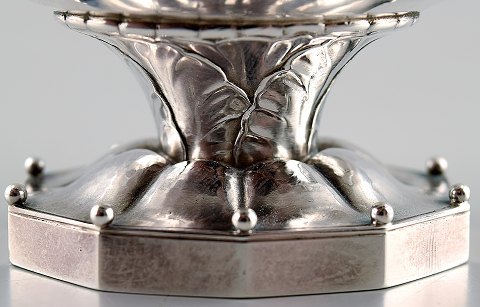 Georg Jensen: Oval skål af hammerslået sterlingsølv. Smedet med kantede fodstykker med kugler samt stammer med bladværk. Georg Jensen 1925-1932. Dessin 42 E. I god stand, med indgravering. Måler 10 x 4,5 cm.