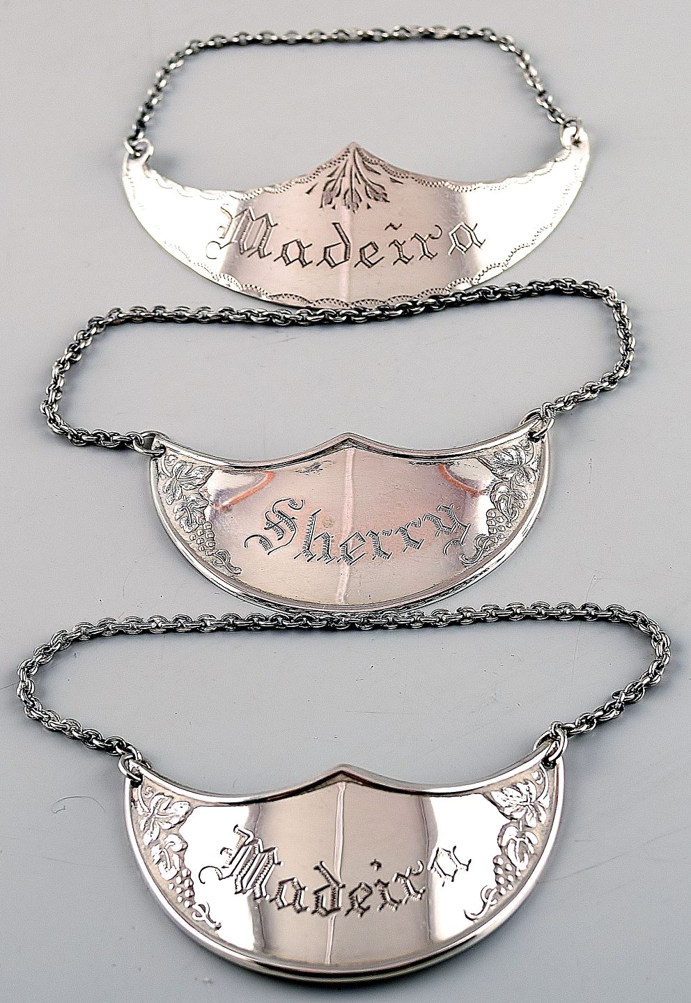 3 sølv karaffelskilte/flaskeskilte, 2 "Madeira" og "sherry". Stemplet 830s. Måler 5,5 cm. I god stand.