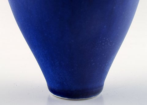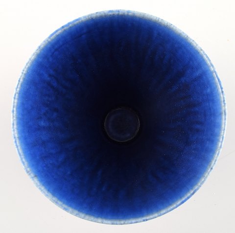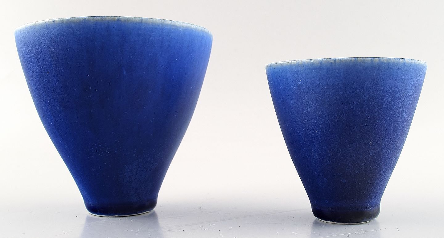 2 Berndt Friberg keramik vaser for Gustavsberg. Moderne svensk design, ca. 1970. Fantastisk glasur i blå nuancer! Perfekt. 1. sortering. Måler 9 x 8,5 cm. og 7 cm. x 6.5 cm.