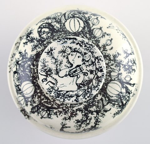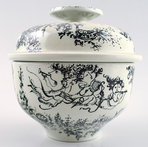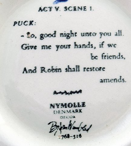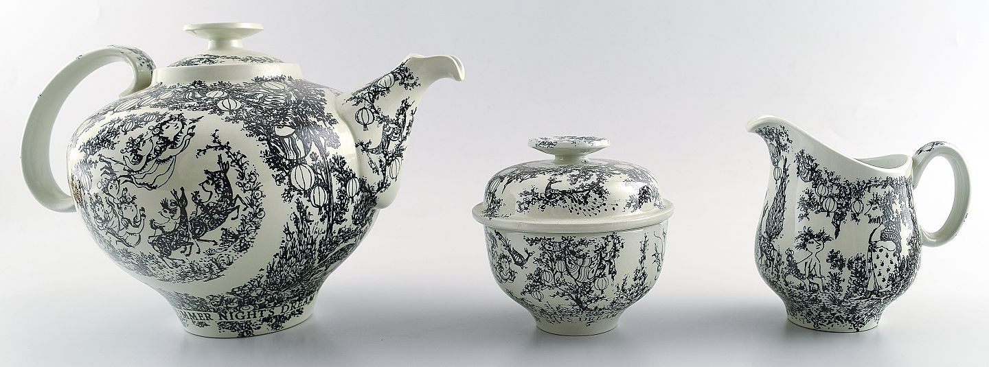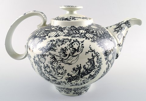 Bjørn Wiinblad, te-sæt, fajance. "Midsummer nights dream" bestående af sukkerskål med låg, flødekande og thekande. Producent: Nymølle Design: Bjørn Wiinblad Perfekt stand. Tekanden måler 25 x 17 cm.