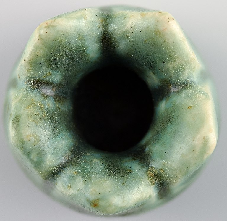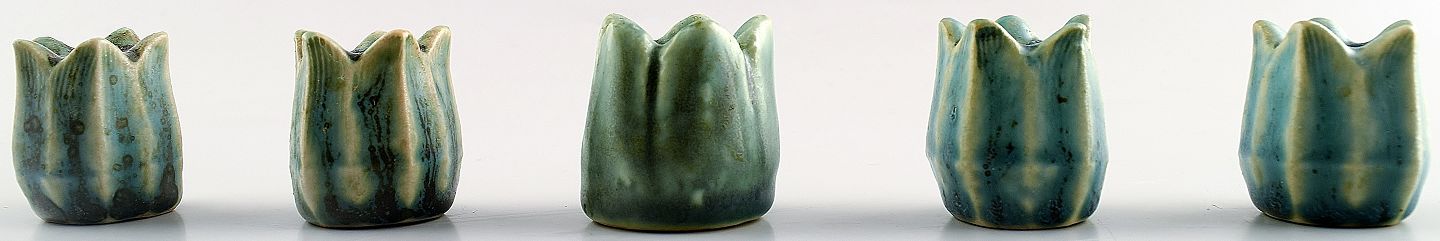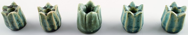 Eva Stæhr-Nielsen for Saxbo 5 lysestager, keramik. Stemplet : E. St. N. Glasur i grønne nuancer. Måler 3,3 cm. I perfekt stand.