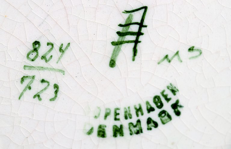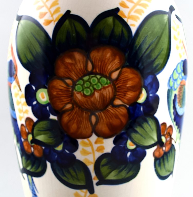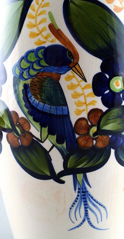 Aluminia/Royal Copenhagen large vase, hand painted with a bird and floral motifs. Measures 41 cm. Number 824/723. In good condition. Hallmarked. Approximately 1920.