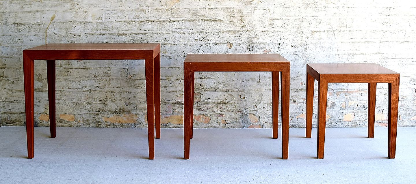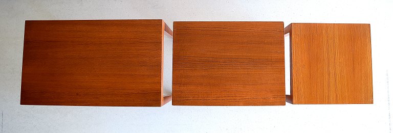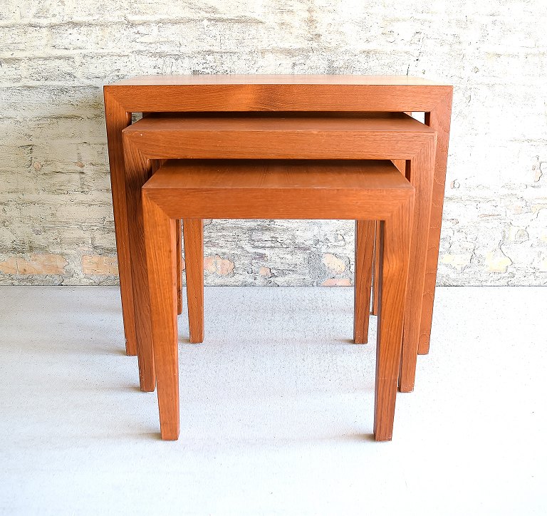 Severin Hansen Jr.: Tre indskudsborde af teak. Model 34 ABC. Udført hos Haslev Møbelsnedkeri. H. 50. L. 57. B. 37. Fremstår med mindre alders- og brugsslitage.