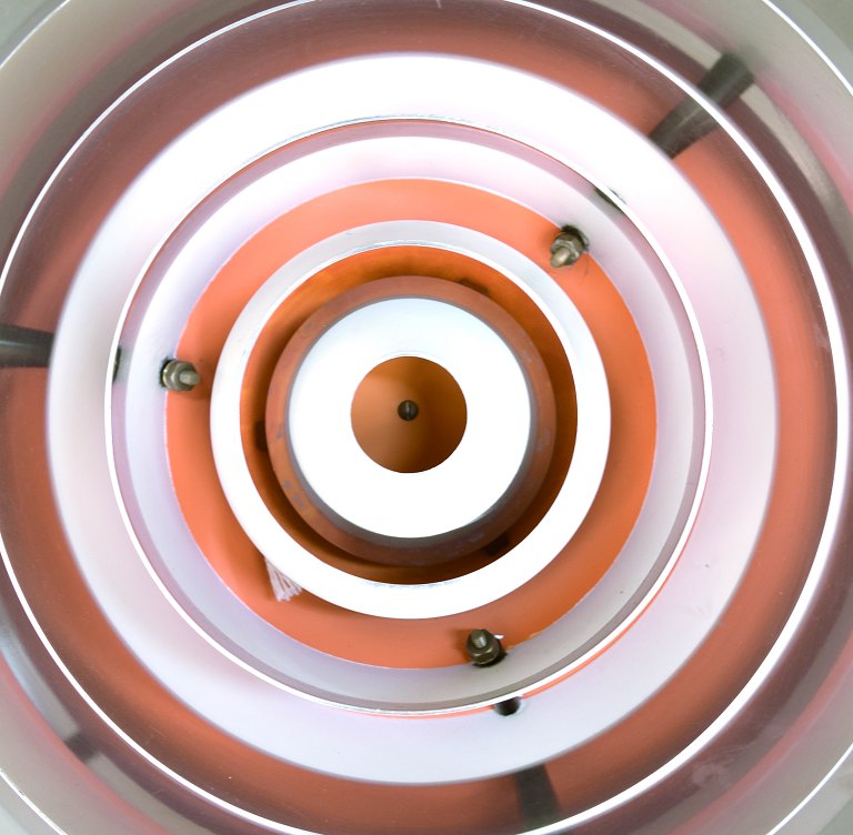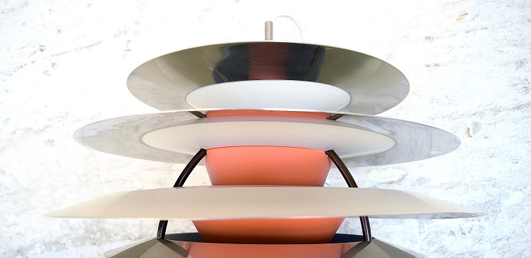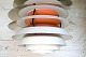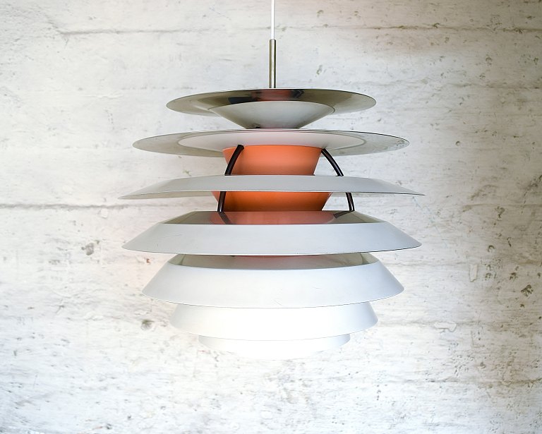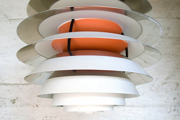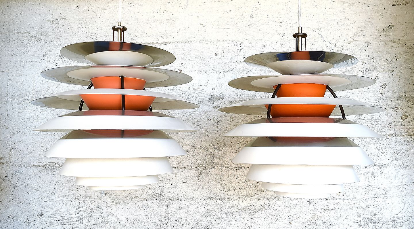 Poul Henningsen: "Kontrast". Et par pendler med hvid- og orangelakerede lameller af metal.