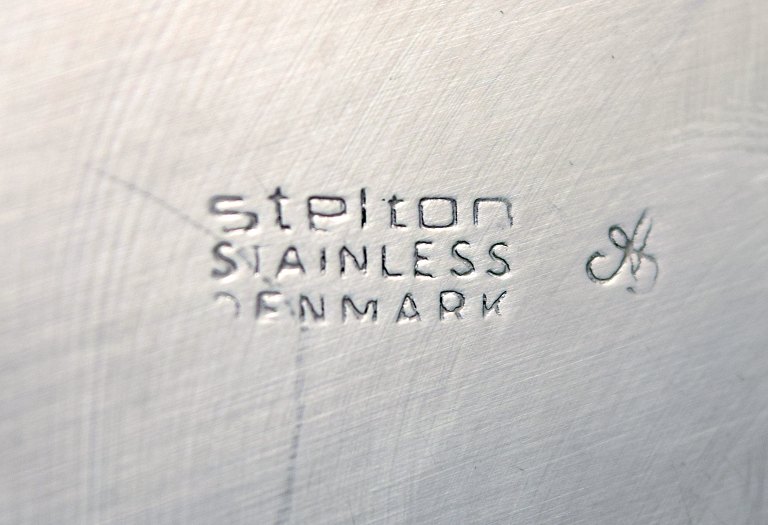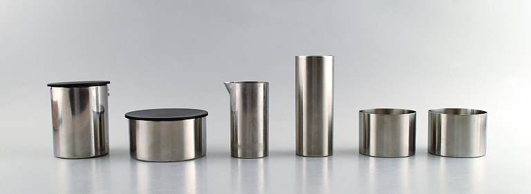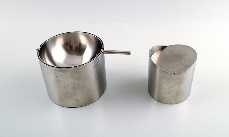 Arne Jacobsen, Stelton, bakke, kande, askebæger mm. i rustfrit stål. I alt 9 dele. 1970/80´erne. Dansk design. I perfekt stand. Stemplet. Bakken måler 35,5 cm. x 1,5 cm.