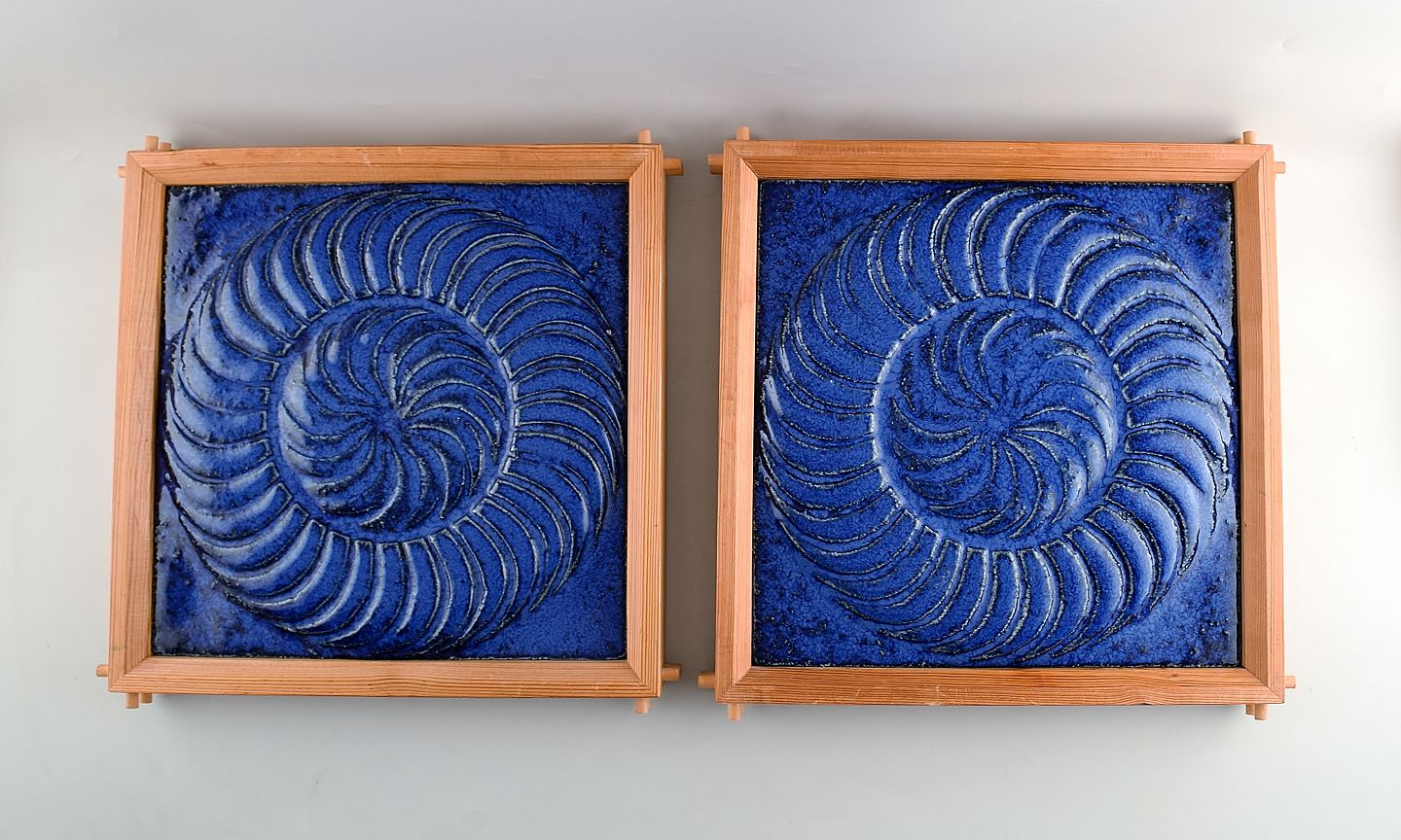 Et par store og tunge stentøjsrelieffer i moderne design. Sverige 1960´erne. Måler 33 x 33 cm. I perfekt stand. Ustemplet.