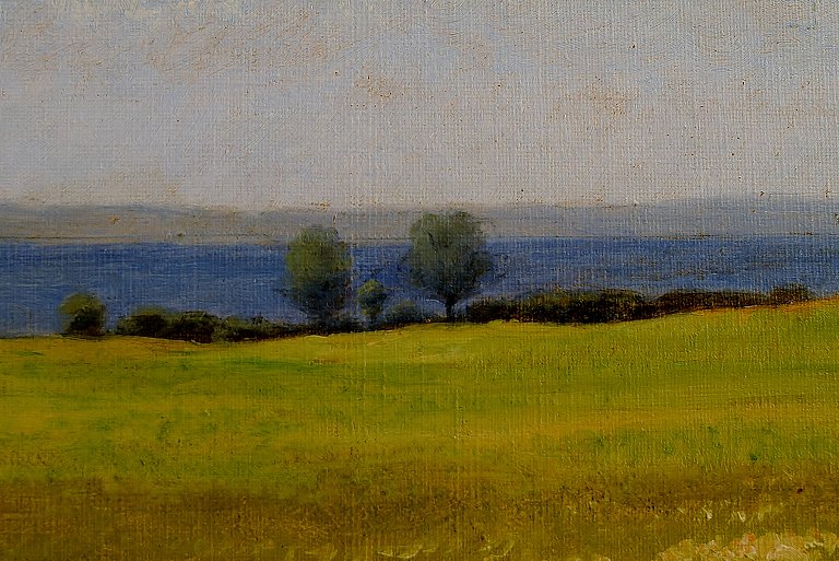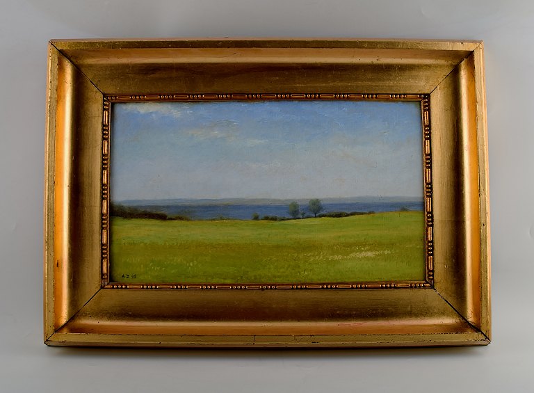 Anton Dorph: f. Horsens 1831, d. København 1914. "Grenå fjord". Smukt sommerlandskab. Sign. A. D 1898. Olie på lærred. Måler (uden rammen) 37 x 21 cm. Rammen måler 8 cm. I flot stand.