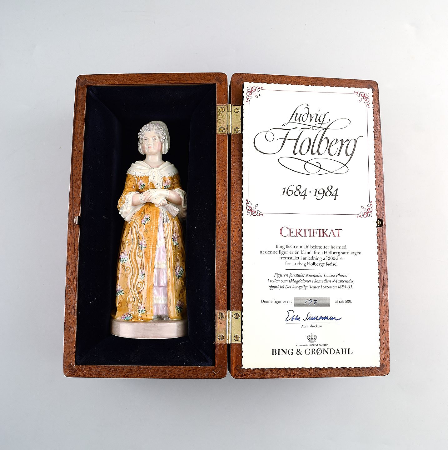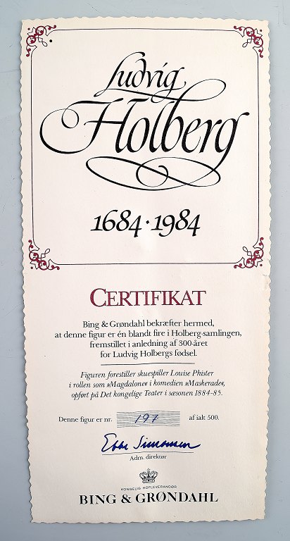 The figure represents Louise Phister in the role of Magdalone in the comedy masquerade performed at the Royal Theatre 1884-85. Holberg Collection is made on the occasion of the 300th anniversary of Ludvig Holberg's birth in 1684.