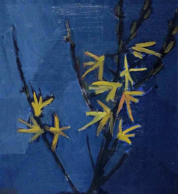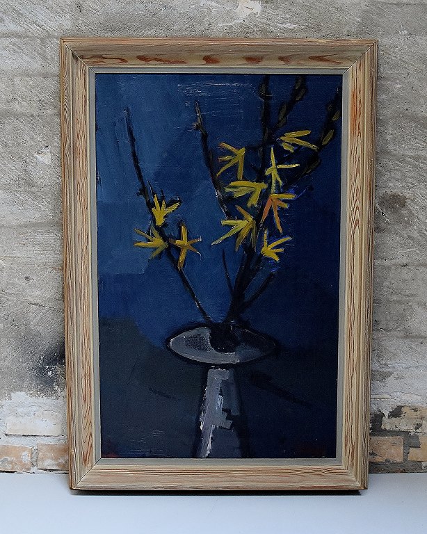 Stig Delang, Swedish artist, "Forsythia" Oil on board. Signed "Delang". Mid. 20th century. Measures (ex. the frame) 70 x 42 cm. The frame measures 6 cm. In perfect condition.