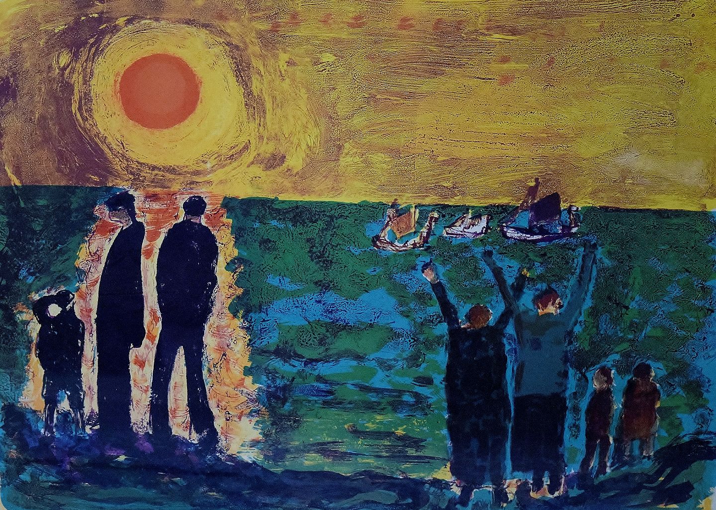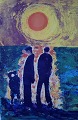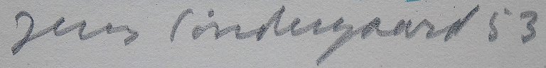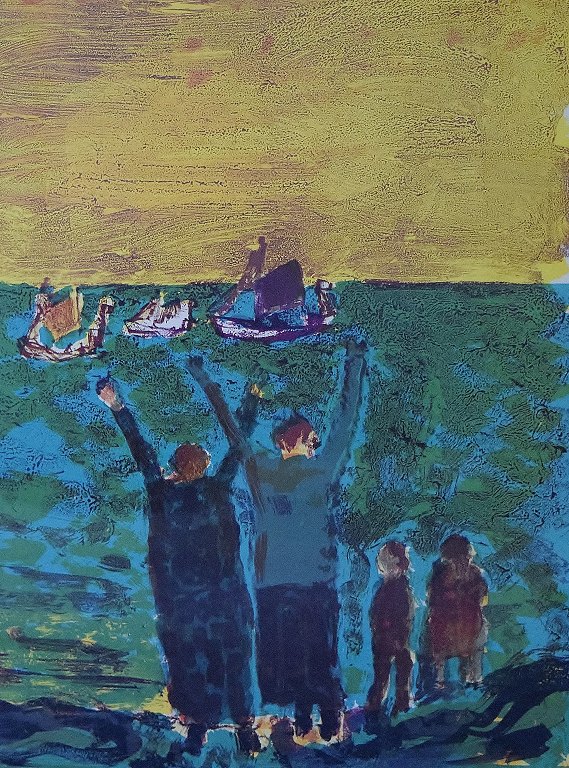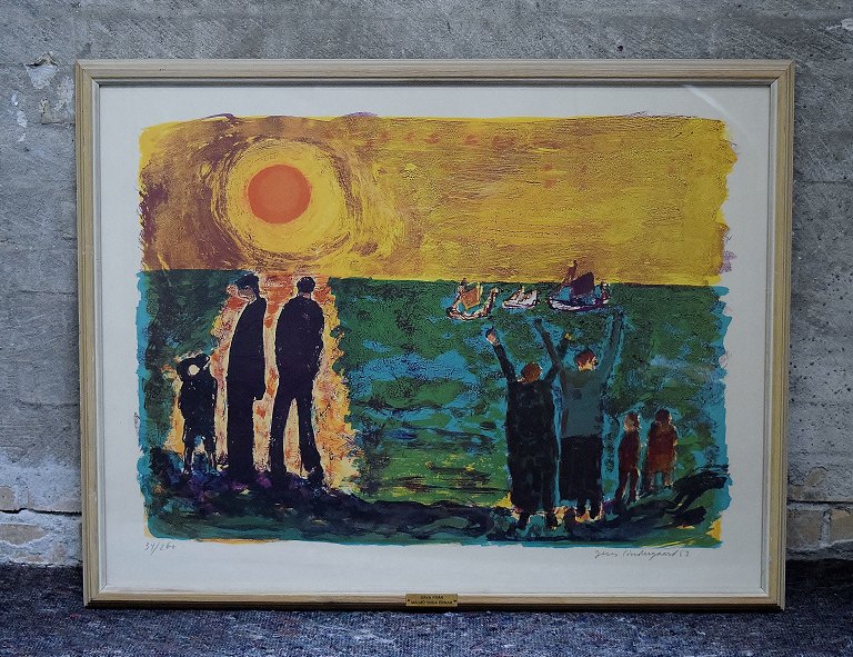 Jens Søndergaard 1895-1957. Kystlandskab med figurer, Farvelitografi. Nummer 34/260, sign. Jens Søndergaard 53. Lysmål 67 x 49 cm. Rammen måler 3 cm. I perfekt stand.