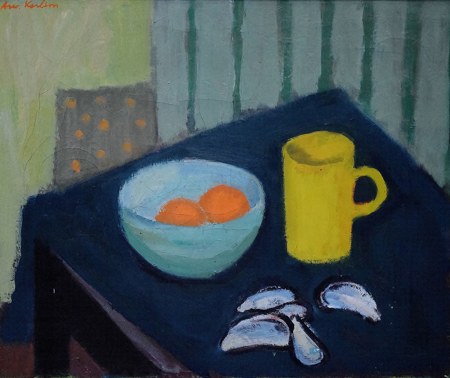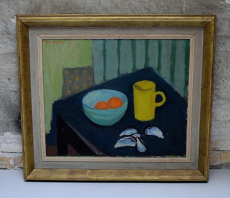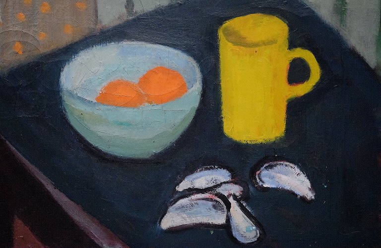 Modernistisk stilleben, olie på lærred. Midt 1900-tallet. I perfekt stand. Utydeligt signeret. Måler (ex. rammen) 55 x 46 cm. Rammen måler 8 cm.