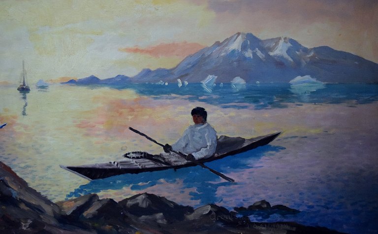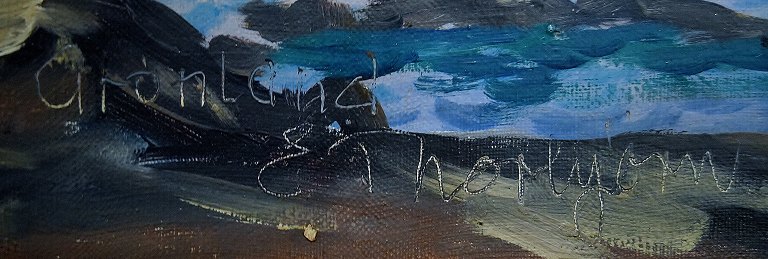 Evelyn Bøje Thorbjørn Andersen: Coastal scene from Greenland. Sign. E. Thorbjørn, Greenland. Mid 20 c. Oil on canvas. Measures 96 x 65 cm. The frame measures 4 cm. In perfect condition.