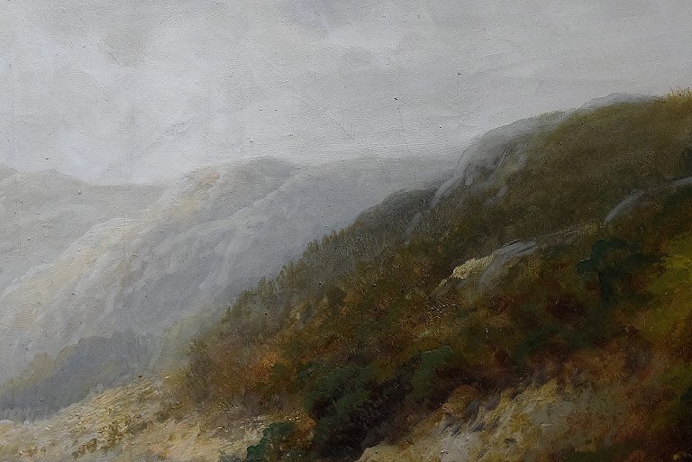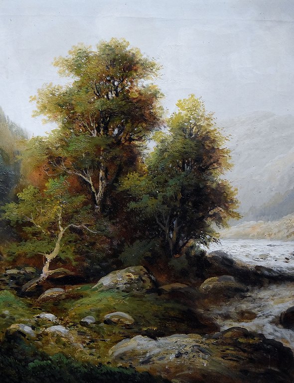 F. L. Gamerith, britisk kunstner, ca. 1900. Olie på lærred. Landskab med flod. 80 x 50 cm. Total størrelse inkl. ramme (106 x 76 cm.) Signeret. I perfekt stand.