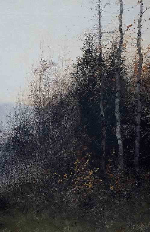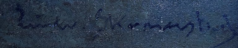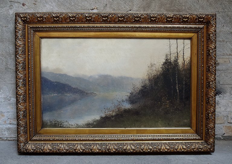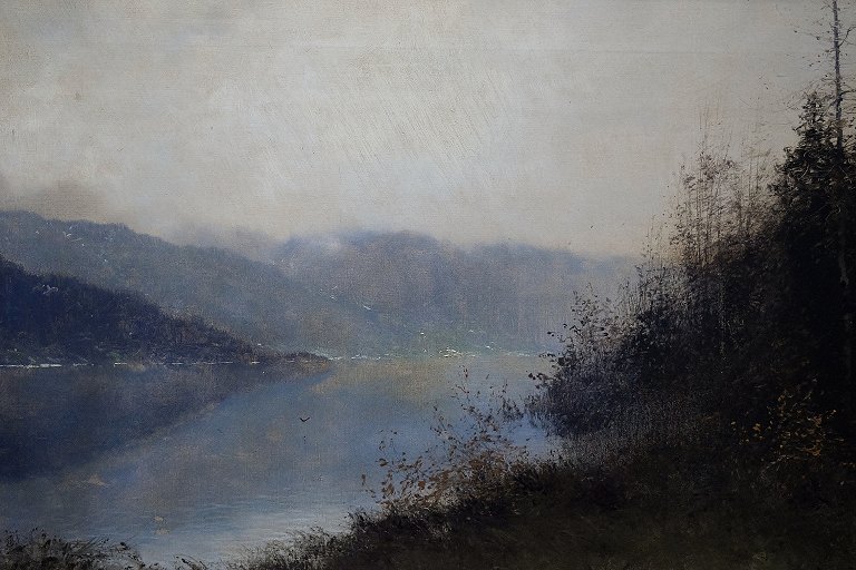 Fog Landscape by Ludvig Skramstad (1855-1912) Swedish artist. Oil on canvas, signed. Measures 42 x 69 cm. (63 x 90 cm.) In perfect condition.
