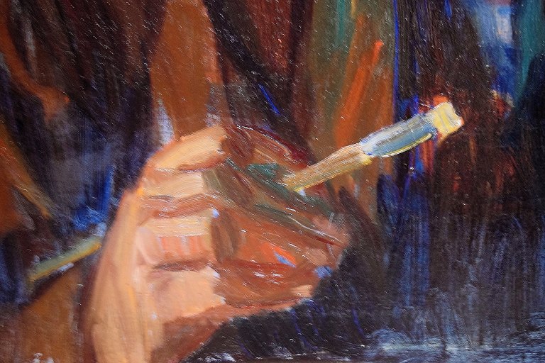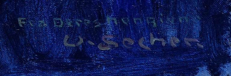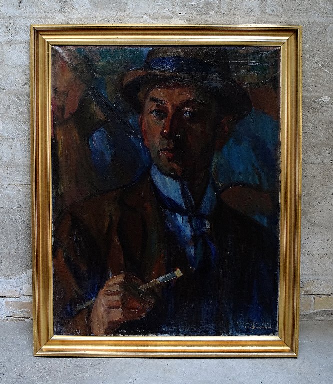 Valdemar Secher, selvportræt, olie på lærred. Signeret, ca. 1930´erne. Måler (ex. rammen) 81 x 92 cm. Rammen er 5 cm. bred og i god stand. I perfekt stand.